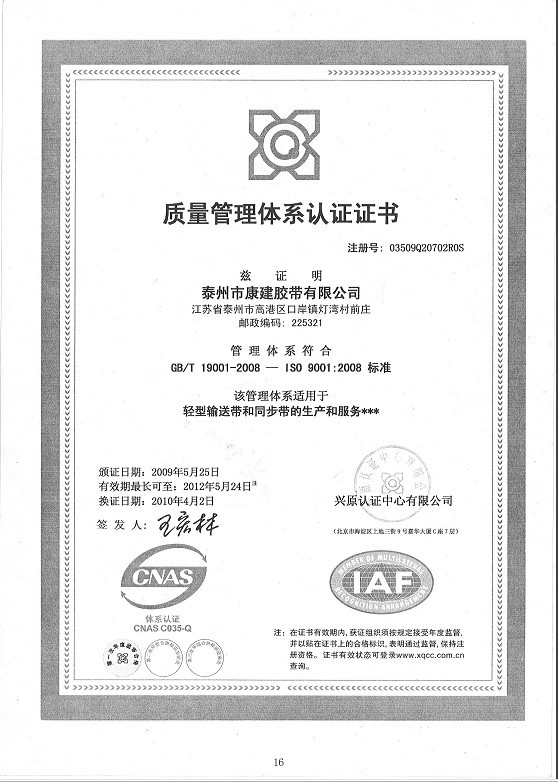 泰州市康建膠帶有限公司經過十多年的發展已經成為一家從事輸送帶和傳動帶類及相關設備生產和銷售的公司。位于中國經濟發達的長三角經濟圈江蘇省泰州市高港區,交通發達。我司以“合格的產品,滿意的服務”為宗旨,發揚團結、開拓、拼搏爭先的創業精神,“康建”在全國行業樹立了良好的企業形象?!翱到ā碑a品已通過ISO9001國際質量體系認證,從原料﹑工藝等方面進行了嚴格的控制,從而確保了產品質量的穩定可靠,成為各......